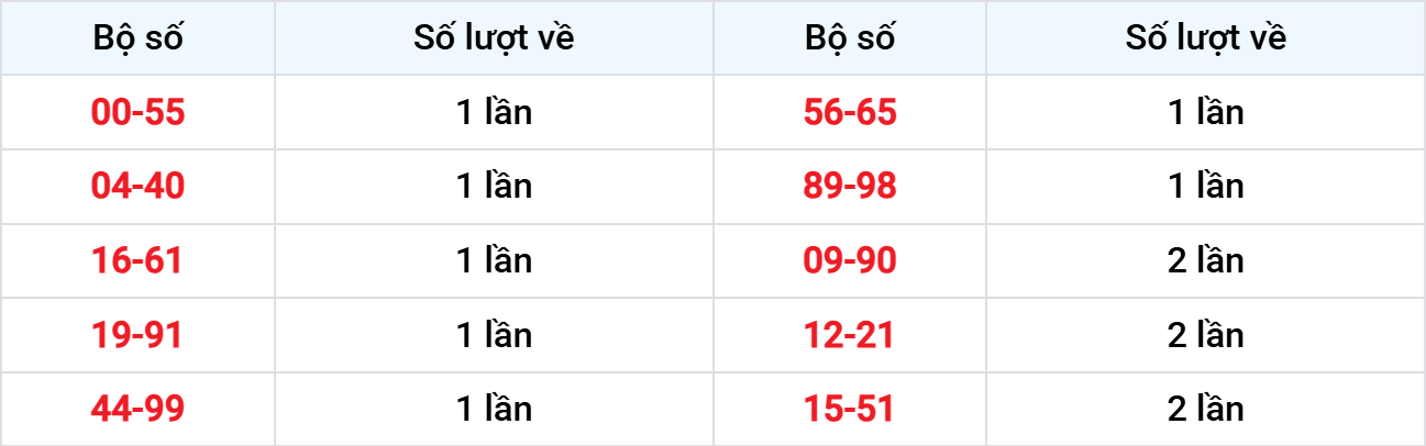 – Cặp lô về cùng nhau: 01-10, 56-65, 57-75