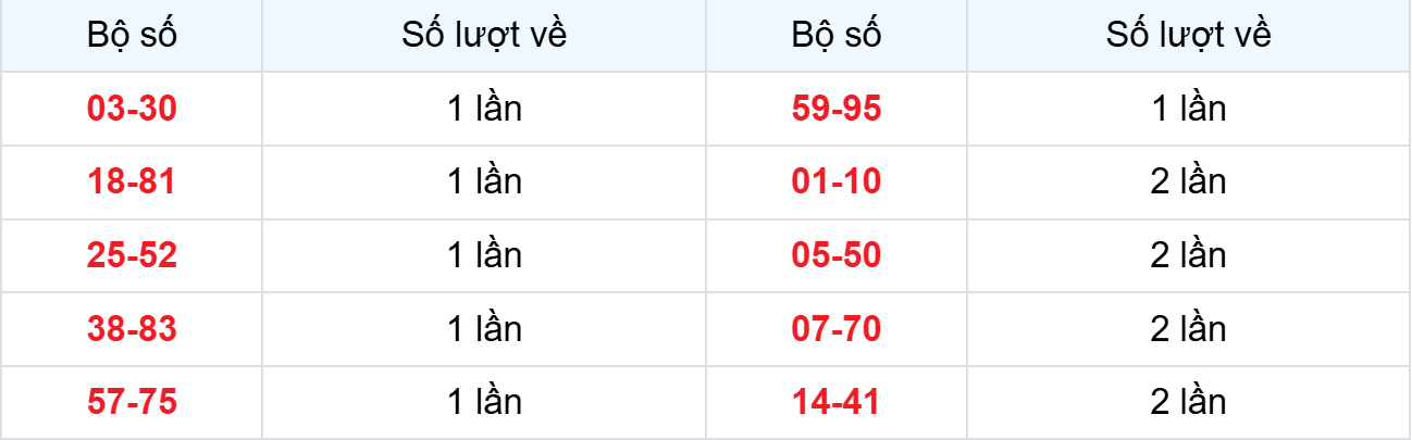 – Cặp lô về cùng nhau: 19-91, 25-52, 36-63, 38-83