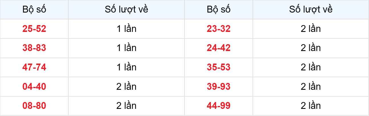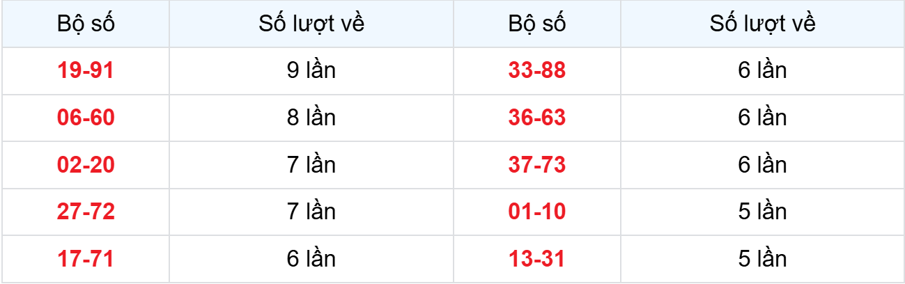 – Cặp lô về cùng nhau: 13-31, 45-54, 59-95